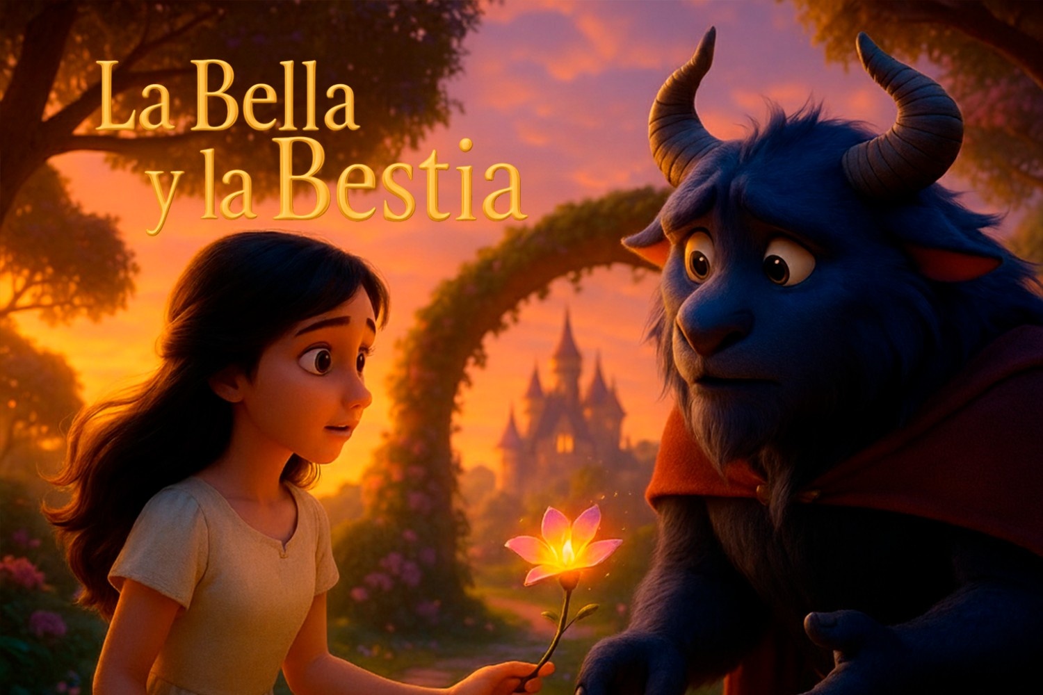 Había una vez un comerciante que vivía con sus tres hijas en una casa alegre y llena de cariño. La mayor soñaba con vestidos elegantes, la segunda con joyas brillantes… y la menor, llamada Bella, solo deseaba algo sencillo: —Padre —dijo con dulzura—, si puedes traerme una rosa cortada con tus propias manos, seré feliz. El comerciante partió a un largo viaje. Cuando ya regresaba a su hogar, una tormenta enorme lo sorprendió. El viento soplaba fuerte, la lluvia era intensa y el camino se volvió oscuro. Cansado y empapado, vio una luz entre los árboles. Era un gran castillo iluminado. Al acercarse, la puerta estaba entreabierta. Aunque llamó varias veces, nadie respondió. Dentro había una mesa servida con comida calientita, como si alguien lo esperara. Con mucho respeto, decidió sentarse. Después de cenar, subió a una habitación con una chimenea encendida y una cama muy cómoda. —Quién sea que vive aquí, es muy generoso —susurró antes de dormirse. A la mañana siguiente encontró una bandeja servida junto a su cama, pero nuevamente… nadie apareció. Cuando se dispuso a marcharse, vio un jardín lleno de flores de mil colores. Y allí, el rosal más hermoso que había visto. Recordó la petición de Bella. —Ella adoraría una rosa tan bonita —pensó mientras cortaba una. En ese instante, apareció una figura grande, cubierta con un elegante traje, pero con aspecto extraño: no era un hombre… tampoco un animal. Era una Bestia, con una presencia imponente y una mirada profunda. —Has tomado algo valioso de mi jardín —dijo con una voz fuerte, pero no cruel—. Te ofrecí refugio y alimento, y te marchas sin pedir permiso. El comerciante se asustó y explicó: —Mi hija Bella ama las flores. Solo quería llevarle una rosa. No pretendía ser irrespetuoso. La Bestia respiró hondo. —Puedes irte —respondió finalmente—. Pero te pido que regreses con Bella. No para hacerle daño, sino porque deseo conocerla. El comerciante volvió a casa preocupado. Pero cuando les contó lo ocurrido, Bella tomó su mano y dijo con ternura: —No tengas miedo, padre. Yo iré. No quiero que sufras por mi causa. Con el corazón apretado, el padre la acompañó. Cuando Bella llegó al castillo, descubrió algo inesperado: la Bestia no era feroz. Era tímida, respetuosa y muy amable. Le ofreció una habitación luminosa, vestidos cómodos, libros, música y un jardín donde podía pasear. Al principio, Bella sentía nervios, pero poco a poco descubrió que la Bestia tenía un corazón bueno. Pasaban tardes conversando junto al fuego. A veces hablaban de viajes; otras, de sueños. Bella se sorprendió de cuánto disfrutaba su compañía. Un día, la Bestia le regaló un espejo mágico. —Así podrás ver a tu familia cuando los extrañes —le dijo con tono suave. Mirándolo, Bella vio a su padre enfermo. —Quisiera verlo… aunque sea un momento —murmuró. La Bestia bajó la cabeza y se alejó unos minutos. Cuando volvió, dijo: —Puedes ir con él. Pero prométeme que regresarás en siete días. Bella lo abrazó con gratitud. —Lo prometo. Gracias por ser tan bueno conmigo. La familia de Bella se alegró al verla. Su padre, al abrazarla, recuperó el ánimo y poco a poco se recuperó por completo. Bella disfrutó tanto estar en casa que olvidó contar los días. Una noche tuvo un sueño inquietante: vio a la Bestia recostada bajo un árbol, triste y débil. —Vuelve… —susurraba. Bella despertó sobresaltada. —He roto mi promesa… y él me necesita —dijo angustiada. Montó su caballo y corrió al castillo. Recorrió pasillos vacíos, llamó su nombre y bajó al jardín. Allí encontró a la Bestia recostada bajo el rosal. —No te dejaré solo —dijo con voz temblorosa—. Estaré contigo. Siempre. La Bestia la miró con ternura. —¿De verdad deseas quedarte? —Sí —respondió Bella—. Tal como eres, eres importante para mí. En ese momento, una luz suave envolvió al castillo. La Bestia se transformó en un joven amable y dulce. —Estaba prisionero por un encantamiento —explicó—. Solo el cariño sincero podía romperlo. Se celebró una boda llena de alegría, y desde ese día el castillo fue conocido como El Castillo de la Rosa. Bella y el joven príncipe vivieron felices, rodeados de jardines, amigos y un amor construido desde la bondad. 🌟 Y así termina nuestra historia... La verdadera belleza está en el corazón: aparece cuando tratamos a otros con bondad, respeto y sinceridad.
